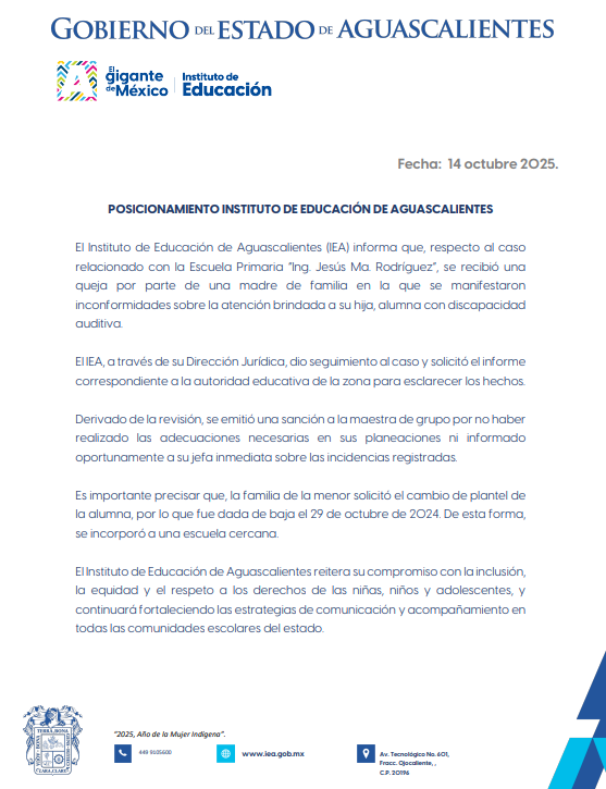 El Instituto de Educación de Aguascalientes (IEA) informa que, respecto al caso relacionado con la Escuela Primaria “Ing. Jesús Ma. Rodríguez”, se recibió una queja por parte de una madre de familia en la que se manifestaron inconformidades sobre la atención brindada a su hija, alumna con discapacidad auditiva.