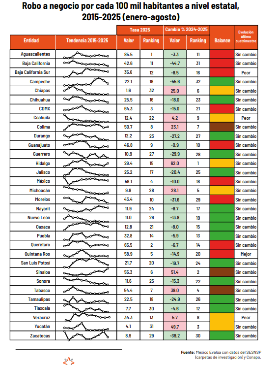 Aguascalientes, el primer lugar a nivel nacional en robo a negocios, indica México Evalúa