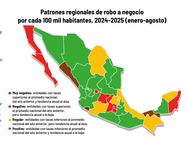 Y es que de 2024 a 2025, Aguascalientes logró reducir en apenas 3.3 puntos la tasa de incidencia delictiva en robo a negocios.