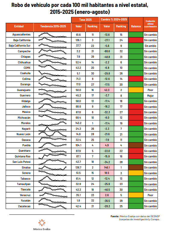 Sin embargo, Aguascalientes reporta cifras positivas respecto a otras modalidades del delito, como robo de vehículo. En el periodo antes mencionado, el estado se posicionó en el lugar número 11 a nivel nacional con mayor incidencia, con una tasa de 61.6 casos por cada 100 mil habitantes, esto significa una reducción de 13.6 puntos frente a 2024.