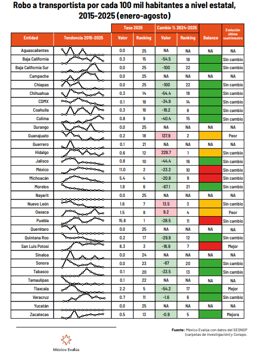 Además, Aguascalientes destaca por ser uno de los nueve estados a nivel nacional sin reportes de robo a transportistas, contrario a lo que registran entidades como Puebla, Estado de México y San Luis Potosí, que se ubican en los primeros tres lugares.