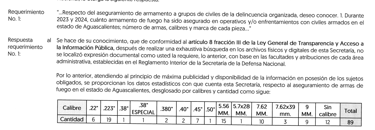 Entre 2023 y 2024, la Secretaría de la Defensa Nacional ha asegurado un total de 89 armas de fuego en Aguascalientes, como parte de los operativos y/o enfrentamientos con civiles armados.