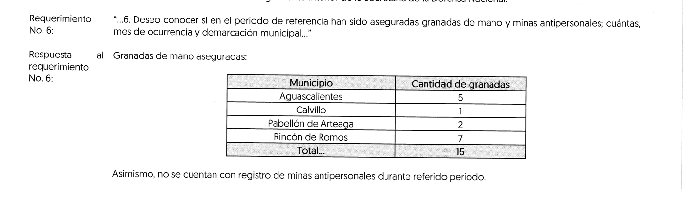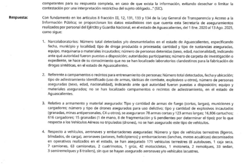 En el periodo antes mencionado, las autoridades federales informan sobre el aseguramiento de 78 armas cortas y 123 largas; más de 16 mil cartuchos, 616 cargadores y 15 granadas, así como 171 vehículos decomisados, dentro de los cuales destacan ocho autobuses, una caja seca, siete camiones, 63 camionetas, dos cuatrimotos, una grúa, 42 motocicletas, una motoneta, dos remolques, 33 sedan, tres semirremolques y ocho tráilers. En esta solicitud, se informa que no se han asegurado aeronaves en el estado de Aguascalientes.