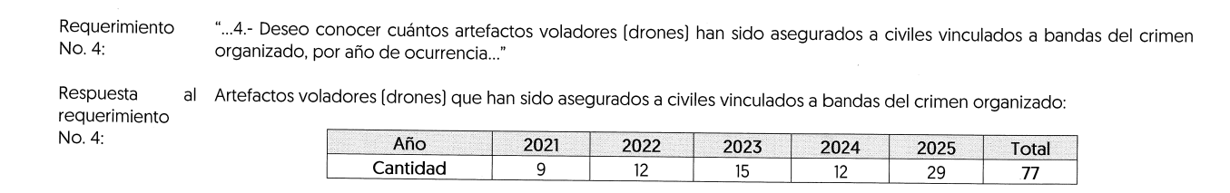 Además, la SEDENA informa sobre el aseguramiento de 77 drones a civiles vinculados a bandas del crimen organizado; nueve en 2021, 12 en 2022, 15 en 2023, 12 en 2024 y 29 en lo que va del presente año al corte del mes de marzo. No obstante, no específica si todos estos decomisos se realizaron en el estado de Aguascalientes.