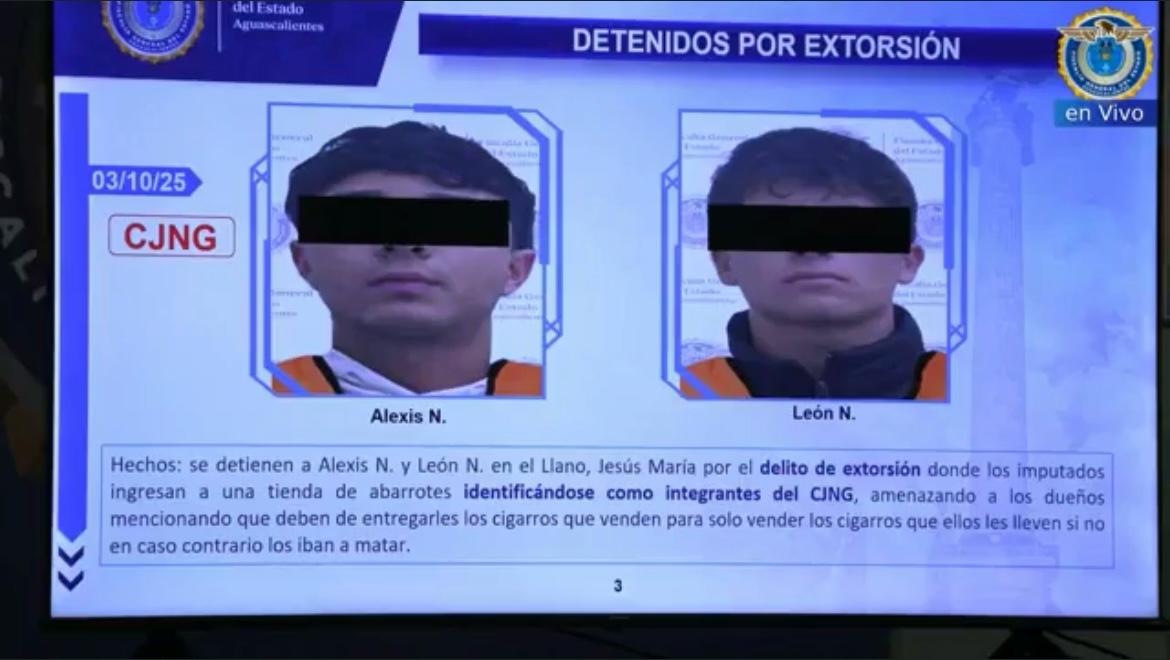 “También se detienen a estos dos sujetos en un seguimiento por tentativa de extorsión o por extorsión en diferentes comercios, estos sujetos los tenemos identificados que forman parte de una célula del cártel, sobre todo llegaban a tiendas o misceláneas donde obligaban o intentaban obligar a las personas a que les compraran ciertos productos de cigarros apócrifos, principalmente tiendas de abarrotes, ya traíamos alguna denuncia por el tema de extorsión y fueron asegurados estos sujetos”