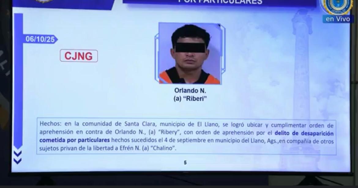 Días después, se logró la detención del presunto lider de una célula, Orlando “N” alias “Riberi”, en el municipio de El Llano, por el delito de desaparición cometida por particulares en contra de Efrén “N” alias “Chalino”; los hechos se registraron el pasado 4 de septiembre.