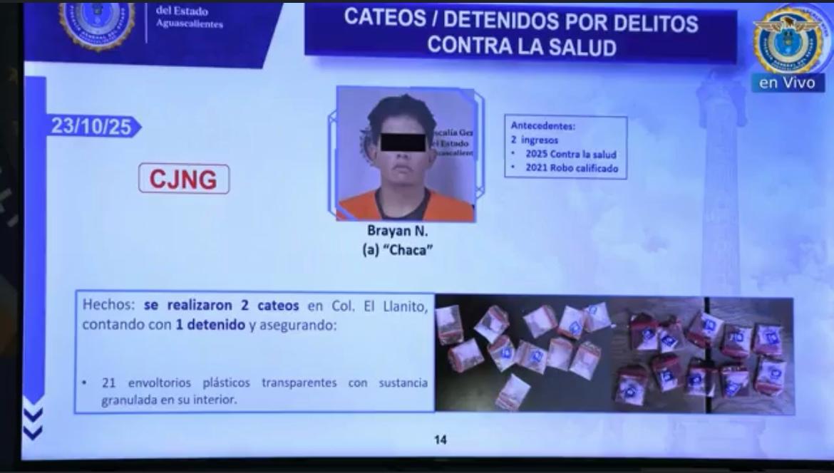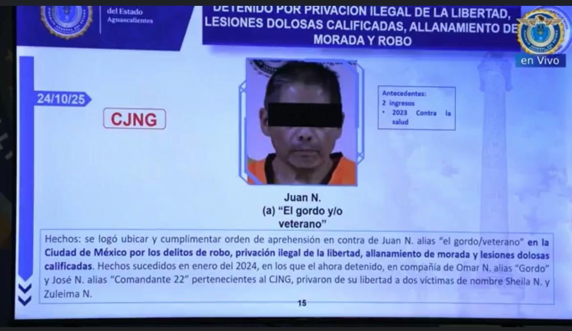“Este sujeto junto con algunos integrantes que en el 2023 venian llevando a cabo esquemas de violencia en el norte del estado, principalmente lo que era la zona de Rincón de Romos, junto precisamente operando en su momento con alias “El Rayo” alias “El Cuchillo”, estos sujetos venían ocasionado violencia haciendo privaciones de la libertad, allanamientos de morada y robo, este sujeto lo teníamos vinculado de que era parte de este grupo que para nosotros era prioridad en su momento con alias “El Gordo”, y alias “El comandante 22”, este sujeto cuando hicimos la detención de los que hoy aparecen ahí como “El comandante 22”, alias “El Gordo”, en su momento “El Kike”, “El Cuchillo”, “El Rayo”, este sujeto huye del estado pero afortunadamente lo pudimos ubicar en colaboración con la Fiscalía de la Ciudad de México”