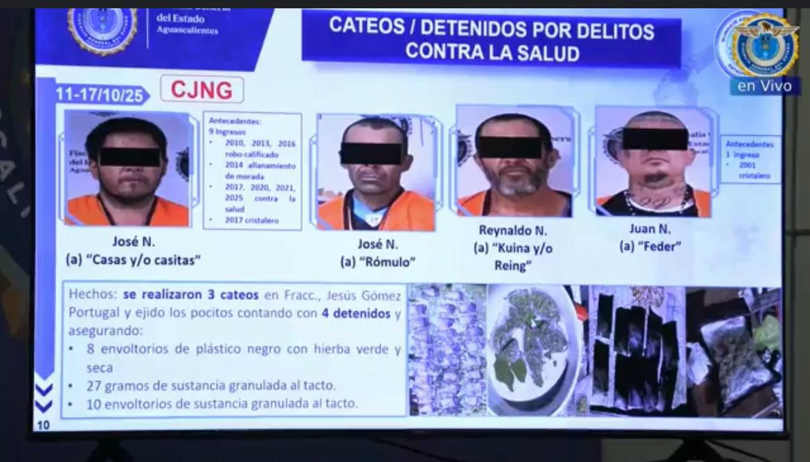 Como parte del informe de resultados de las detenciones de alto impacto realizadas por la Fiscalía General del Estado, se revela que tan solo el pasado mes de octubre, el órgano logró la detención de 11 personas presuntamente vinculadas a un cártel con presencia en Aguascalientes.