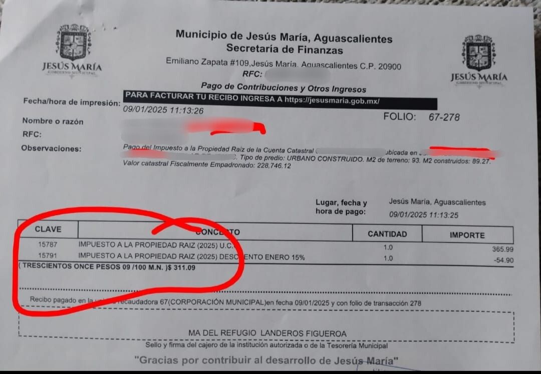 De acuerdo con una denuncia ciudadana anónima realizada a BI Noticias, se consigna, por ejemplo, que en una de las zonas habitacionales del municipio de Jesús María, el cobro del predial en 2025 fue de 311.09 pesos. Para este 2026, el cálculo del gravámen incrementó a mil 581 pesos, lo que representa un incremento cercano al 400%.