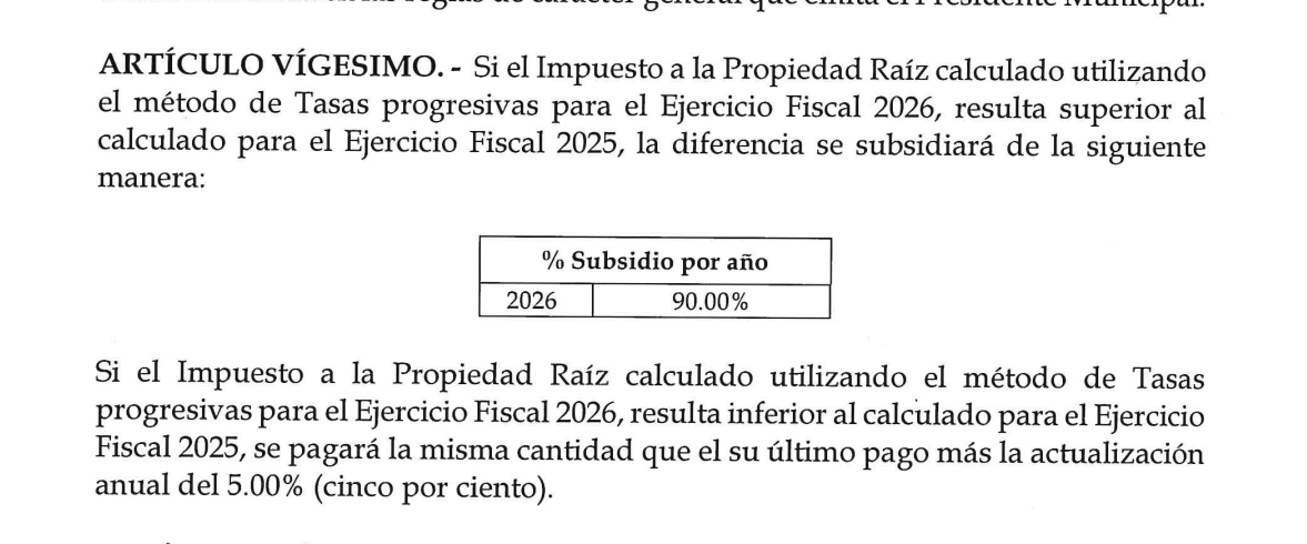 Cabe señalar que se realizaron modificaciones a los topes establecidos, pues en la Ley de Ingresos del Municipio de Jesús María para 2026, se consigna un tope del 10% y un subsidio del 90% en los casos en los que se registren aumentos frente a los cálculos de 2025.