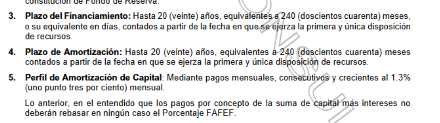 El plazo de financiamiento, es decir, el tiempo total durante el cual el préstamo estará vigente, será de hasta 20 años, equivalentes a 240 meses o su equivalente en días, a partir de la fecha que se ejerza la primera y única disposición de los recursos. Se establece el mismo periodo como plazo de amortización, el tiempo en el que el gobierno estatal se tardará en pagar el capital del préstamo.