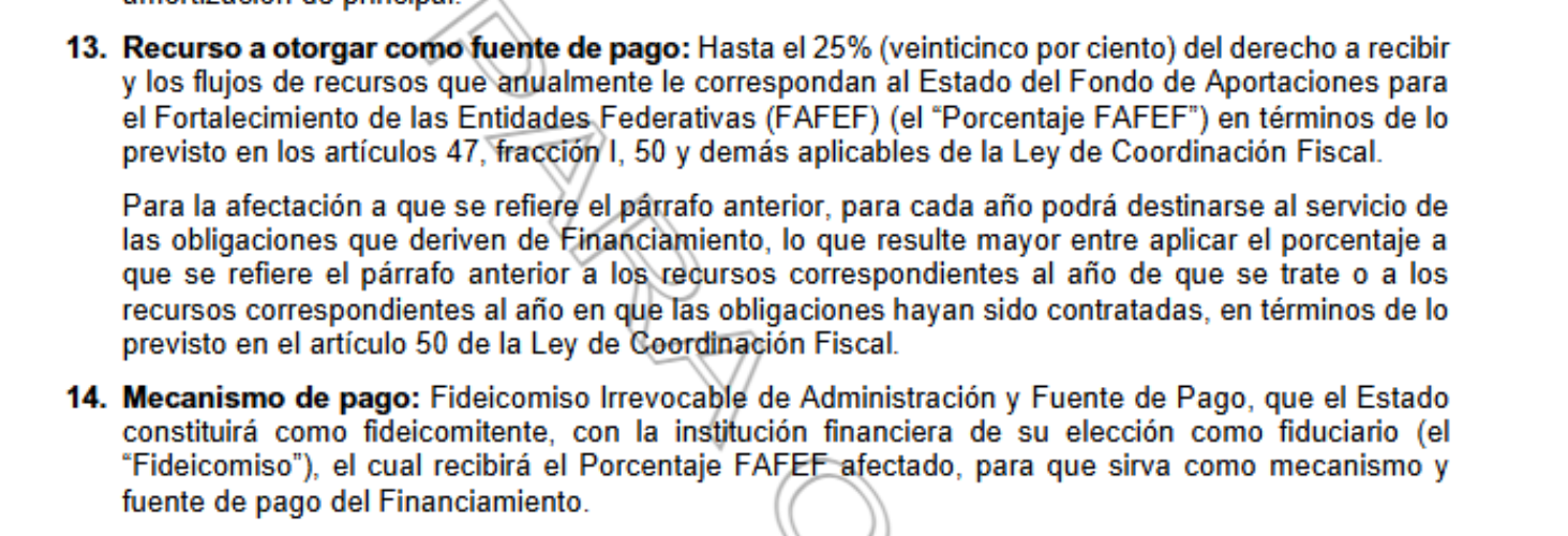 Para el pago de esta deuda, se compromete hasta el 25% de los recursos provenientes anualmente del Fondo de Aportaciones para el Fortalecimiento de las Entidades Federativas. Como mecanismo de pago, se constituirá un Fideicomiso Irrevocable de Administración y Fuente de Pago, además de un fondo de reserva equivalente a dos meses del servicio de la deuda, conformado por recursos estatales.