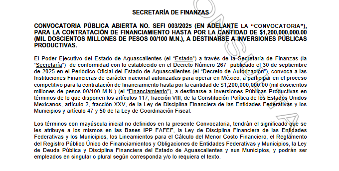El Gobierno del Estado de Aguascalientes, a través de la Secretaría de Finanzas, convoca a las Instituciones Financieras de carácter nacional autorizadas para operar en el país, a participar en el proceso de contratación de financiamiento, hasta por mil 200 millones de pesos. El monto podrá disminuir dependiendo de la suficiencia de la fuente de pago.