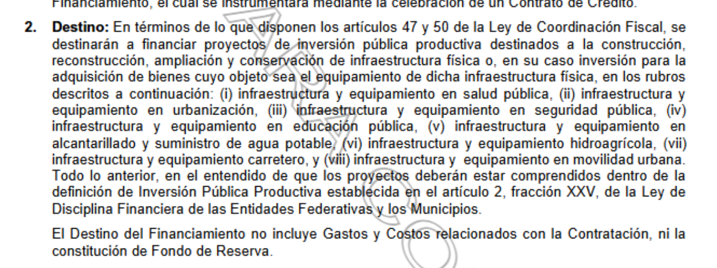 En la convocatoria, se precisa que este recurso se destinará a Inversiones Públicas Productivas, como la construcción, reconstrucción, ampliación y conservación de infraestructura física y adquisición de equipamiento, en materia de salud, urbanización, seguridad pública, educación, alcantarillado y suministro de agua potable, hidroagrícola, carretera y movilidad urbana.