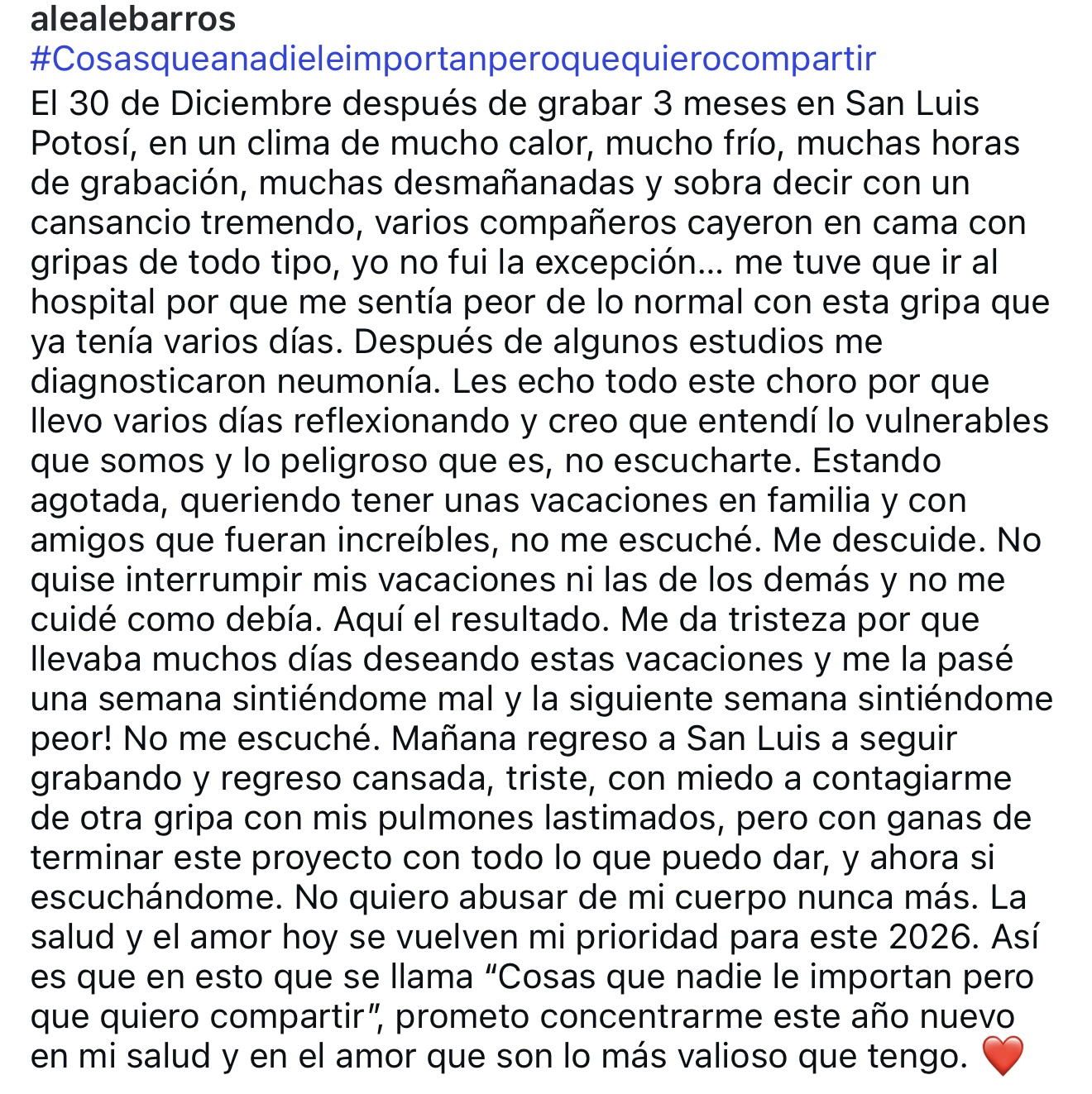 "El 30 de diciembre después de grabar 3 meses en San Luis Potosí, en un clima de mucho calor, mucho frío, muchas horas de grabación, muchas desmañanadas y sobra decir con un cansancio tremendo… me tuve que ir al hospital porque me sentía peor de lo normal con esta gripa que ya tenía varios días”, escribió.