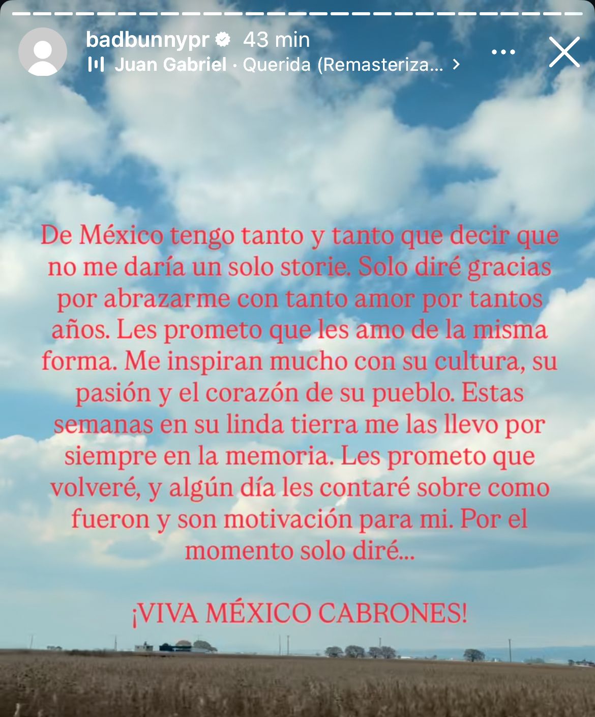 En su mensaje de despedida, Bad Bunny expresó que México y su gente han sido una fuente de inspiración constante para él, y reconoció el cariño de sus seguidores a lo largo de los años. “De México tengo tanto y tanto que decir que no me daría un solo storie. Solo diré gracias por abrazarme con tanto amor por tantos años. Les prometo que les amo de la misma forma. Me inspiran mucho con su cultura, su pasión y el corazón de su pueblo… ¡VIVA MÉXICO CABRONES!”, escribió, dejando claro que su conexión con el país va más allá de los escenarios y que planea regresar en el futuro.
