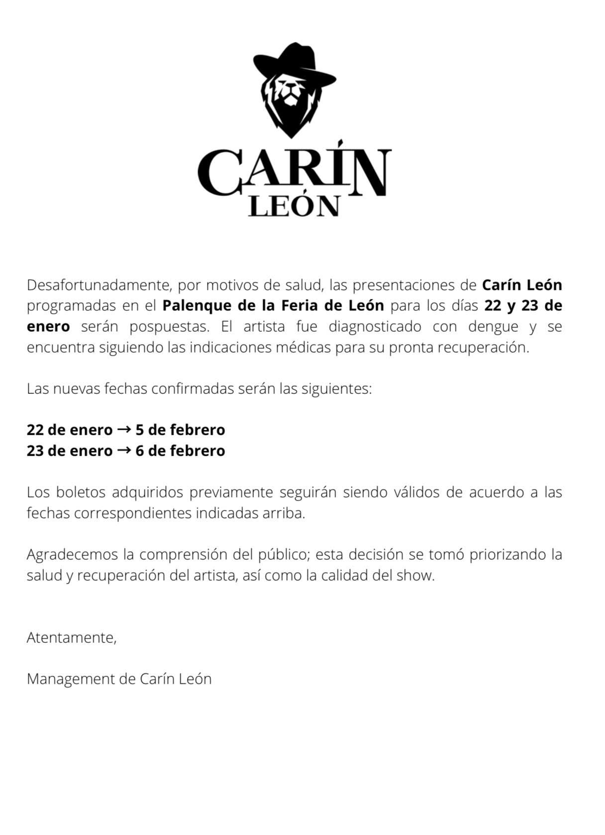 El equipo de Carín León anunció este día que el cantante tendrá que posponer las presentaciones que tenía programadas los días jueves 22 y viernes 23 de enero en el Palenque de la Feria de León, luego de ser diagnosticado con dengue.