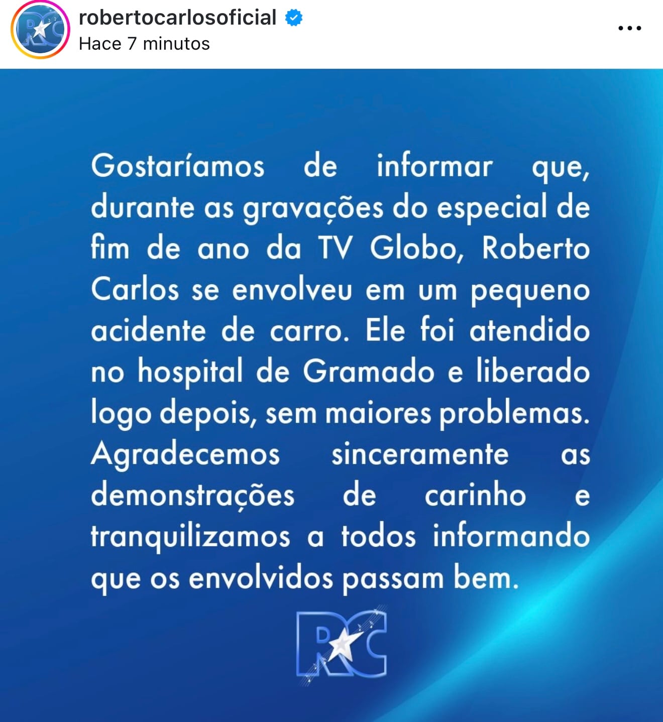 "Nos gustaría informarles que, durante la filmación del especial de fin de año de TV Globo, Roberto Carlos estuvo involucrado en un pequeño accidente automovilístico", se lee.