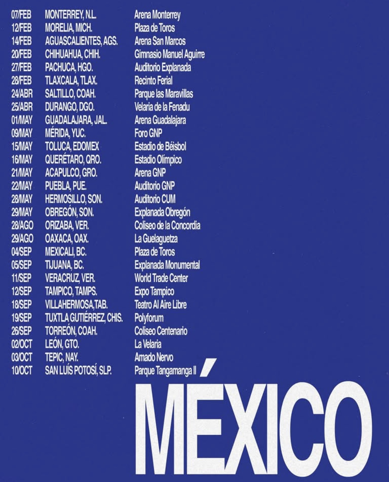 Después de la capital hidrocálida, el también compositor recorrerá gran parte del país llegando a ciudades como Chihuahua, Pachuca, Tlaxcala, Saltillo, Guadalajara, Querétaro, León y San Luis Potosí, entre muchas otras.