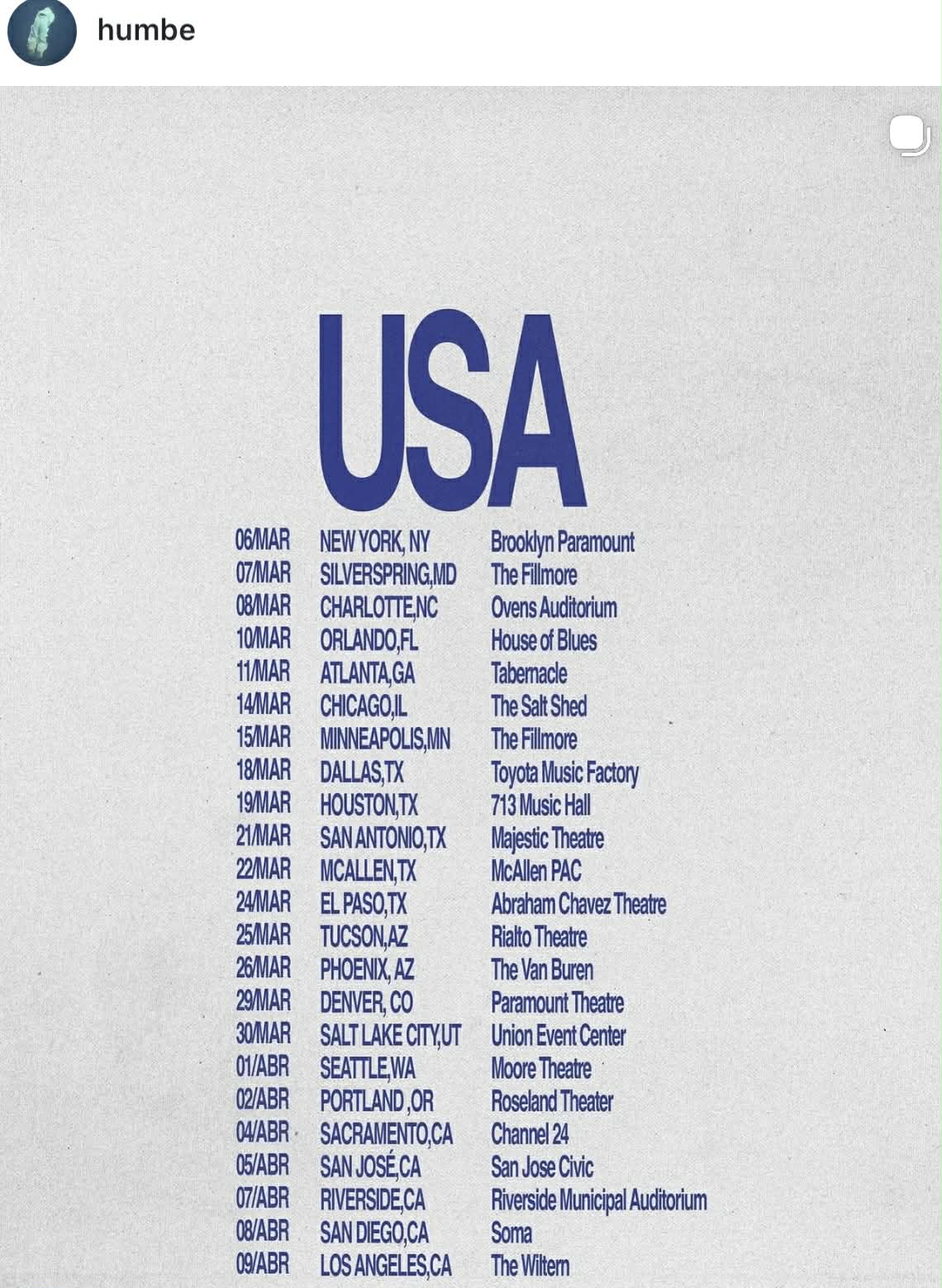 La gira de Humbe en Estados Unidos se realizará del 6 de marzo al 9 de abril llevando su show en vivo a ciudades como Nueva York, Atlanta, Chicago, Houston, San Antonio, El Paso, Seattle, Portland, San Diego, Los Ángeles y más.