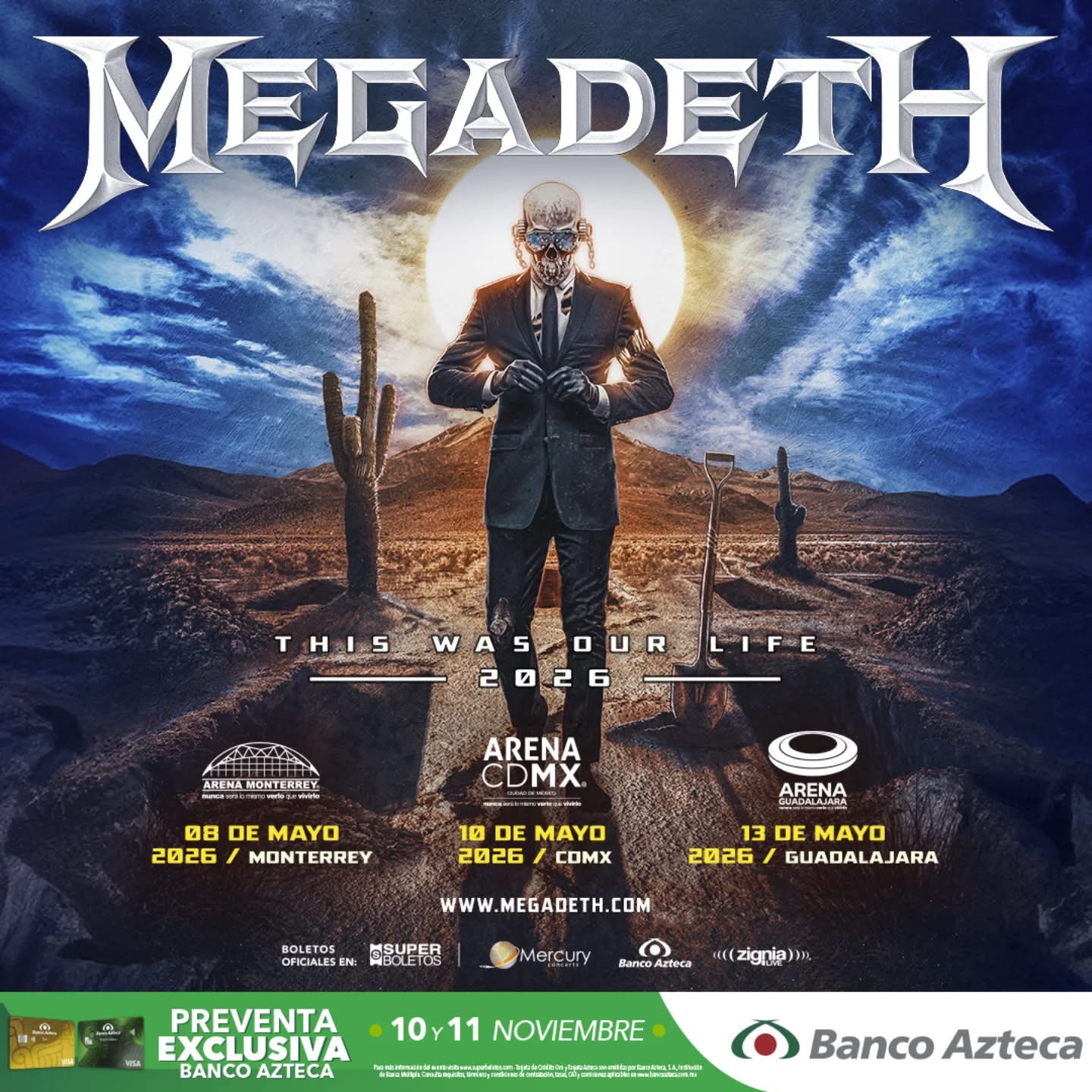 Megadeth se presentará en la Arena Monterrey el 8 de mayo de 2026, en la Arena CDMX, de la capital mexicana, el 10 de mayo y en la Arena Guadalajara, el 13.