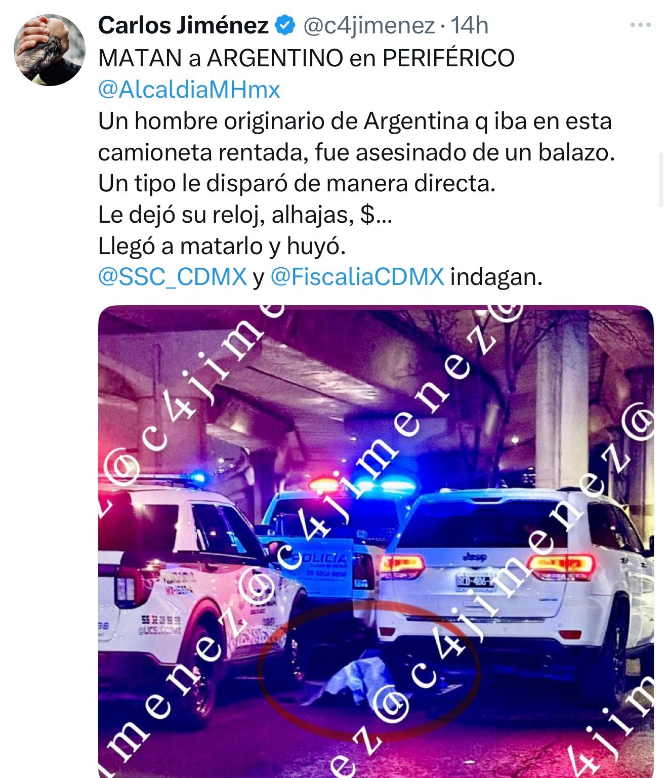 “Personal de la SSC tomó conocimiento de un hombre que perdió la vida, por impactos de arma de fuego, al parecer por un ataque directo, en la lateral del anillo Periférico a la altura de la calle Electrificación, en la colonia Ampliación Daniel Garza, de la alcaldía Miguel Hidalgo”, se lee.