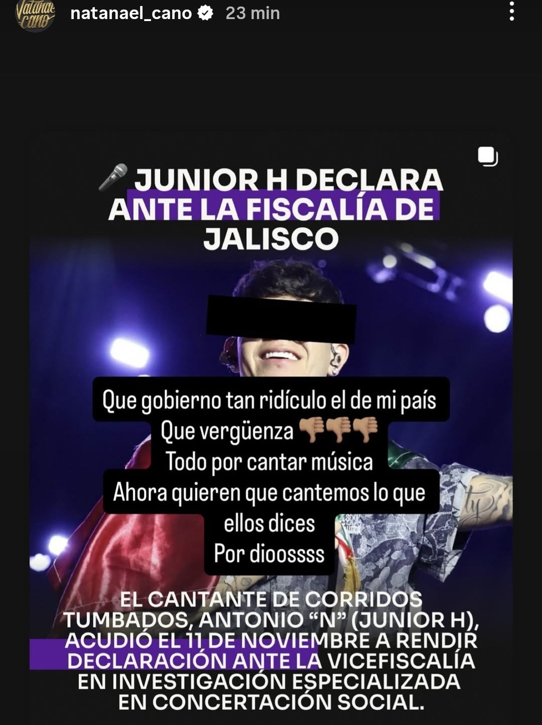 El cantante Natanael arremetió en contra de las autoridades expresando su molestia tras lo sucedido con su colega, Junior H, quien se presentó a comparecer en Jalisco tras interpretar corridos que hacen apología del delito en su pasada presentación en las Fiestas de Octubre.