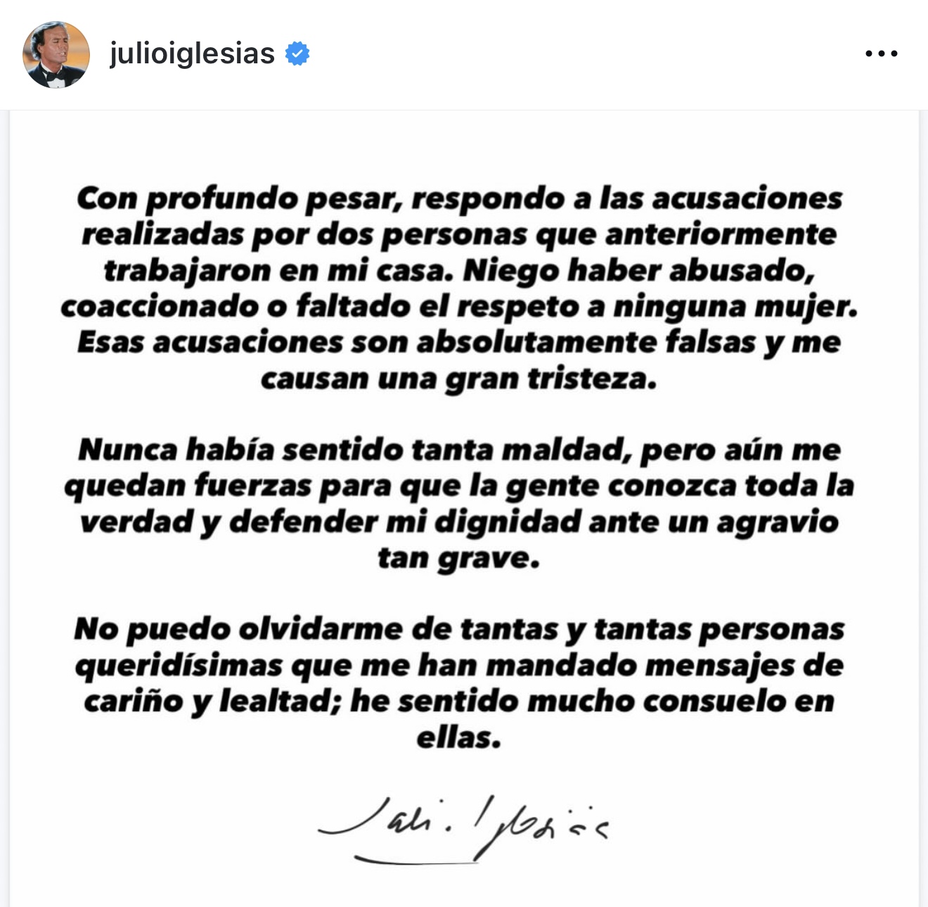 Julio Iglesias aprovechó el comunicado para agradecer a las personas que le han mandado mensajes de cariño y le han demostrado lealtad.