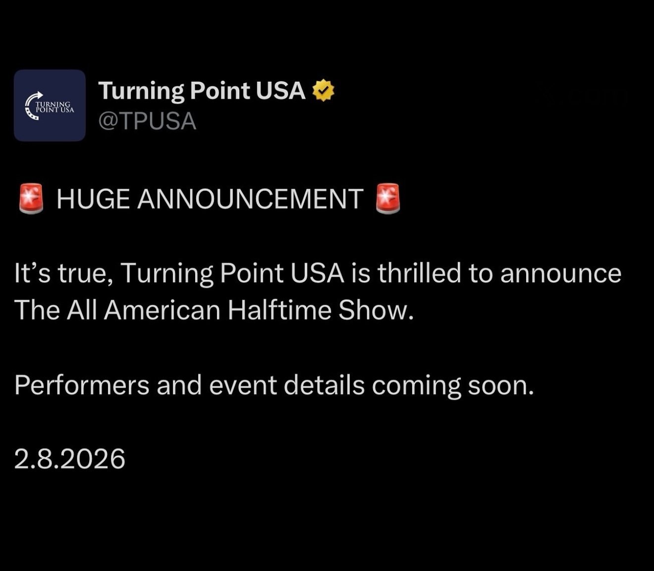 A través de redes sociales, la organizaciónTurning Point USA publicó un comunicado en el que anuncian que realizarán su propio espectáculo de medio tiempo.