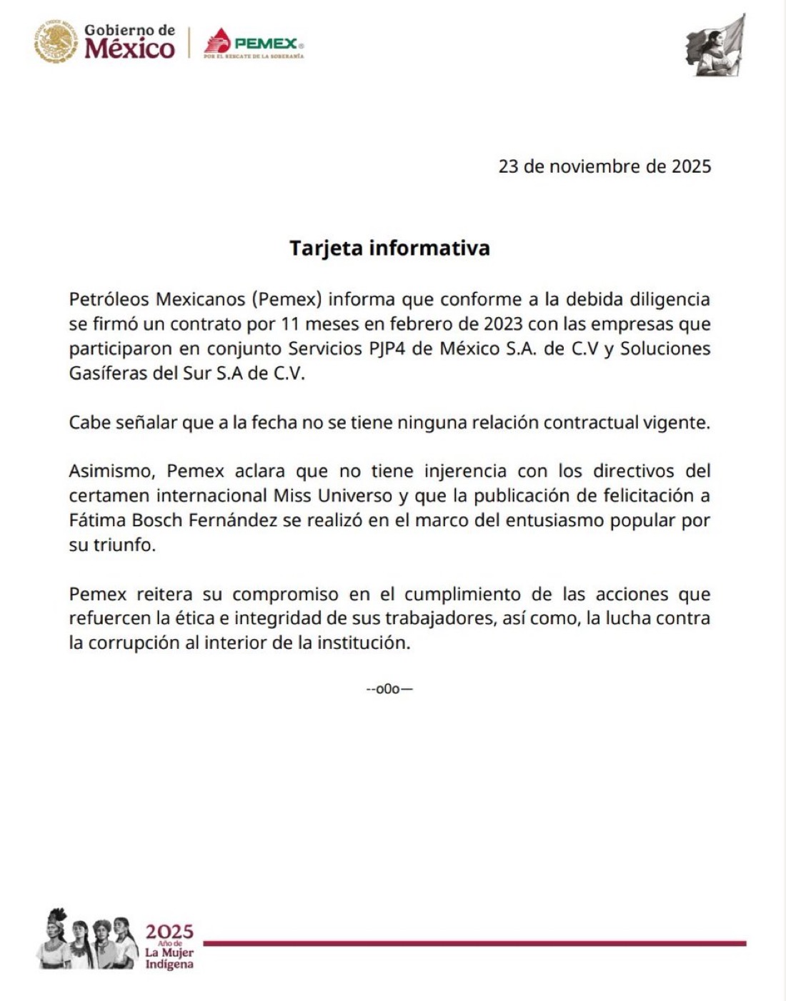 Pemex menciona que “no tiene injerencia con los directivos del certamen internacional Miss Universo y que la publicación de felicitación a Fátima Bosch Fernández se realizó en el marco del entusiasmo popular por su triunfo”.