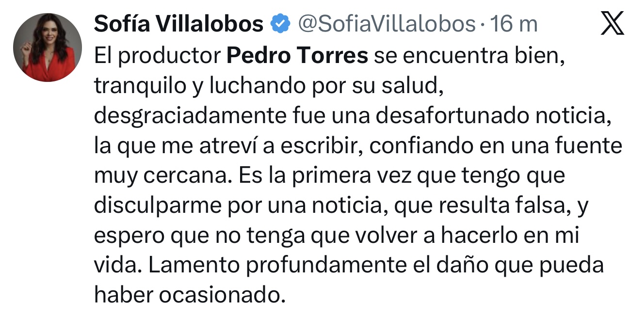"El productor Pedro Torres se encuentra bien, tranquilo y luchando por su salud, desgraciadamente fue una desafortunado noticia, la que me atreví a escribir, confiando en una fuente muy cercana. Es la primera vez que tengo que disculparme por una noticia, que resulta falsa, y espero que no tenga que volver a hacerlo en mi vida. Lamento profundamente el daño que pueda haber ocasionado", expresó.