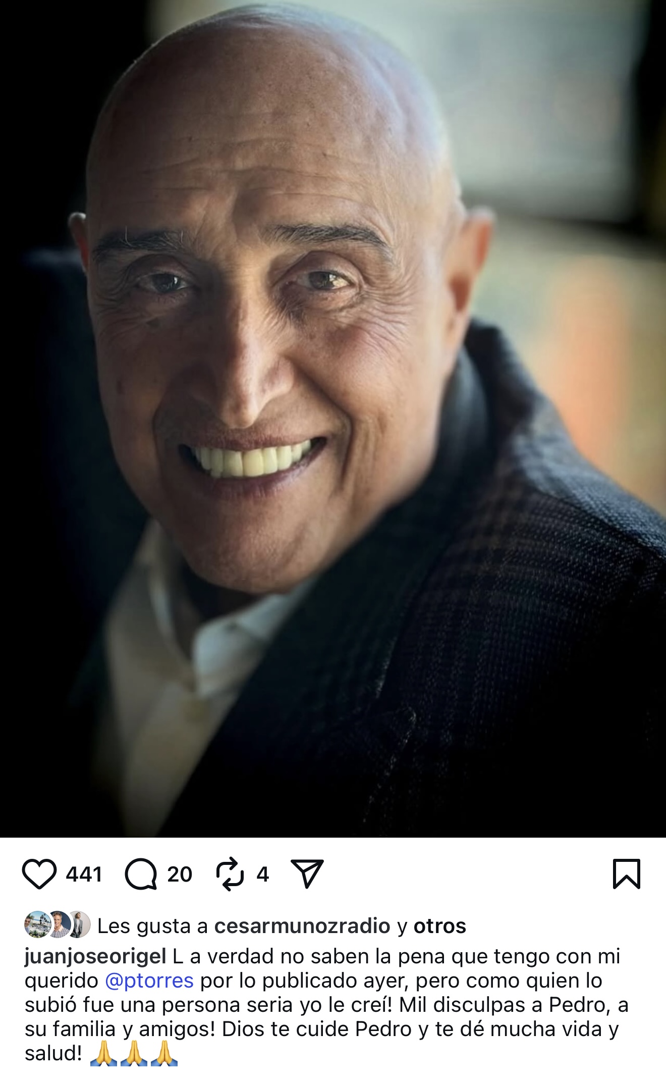 Juan José Origel, quien también había hecho una publicación lamentando la partida de Torres, ofreció disculpas en su perfil de Instagram: "No saben la pena que tengo con mi querido Pedro Torres por lo publicado ayer, pero como quien lo subió fue una persona seria, yo le creí.
