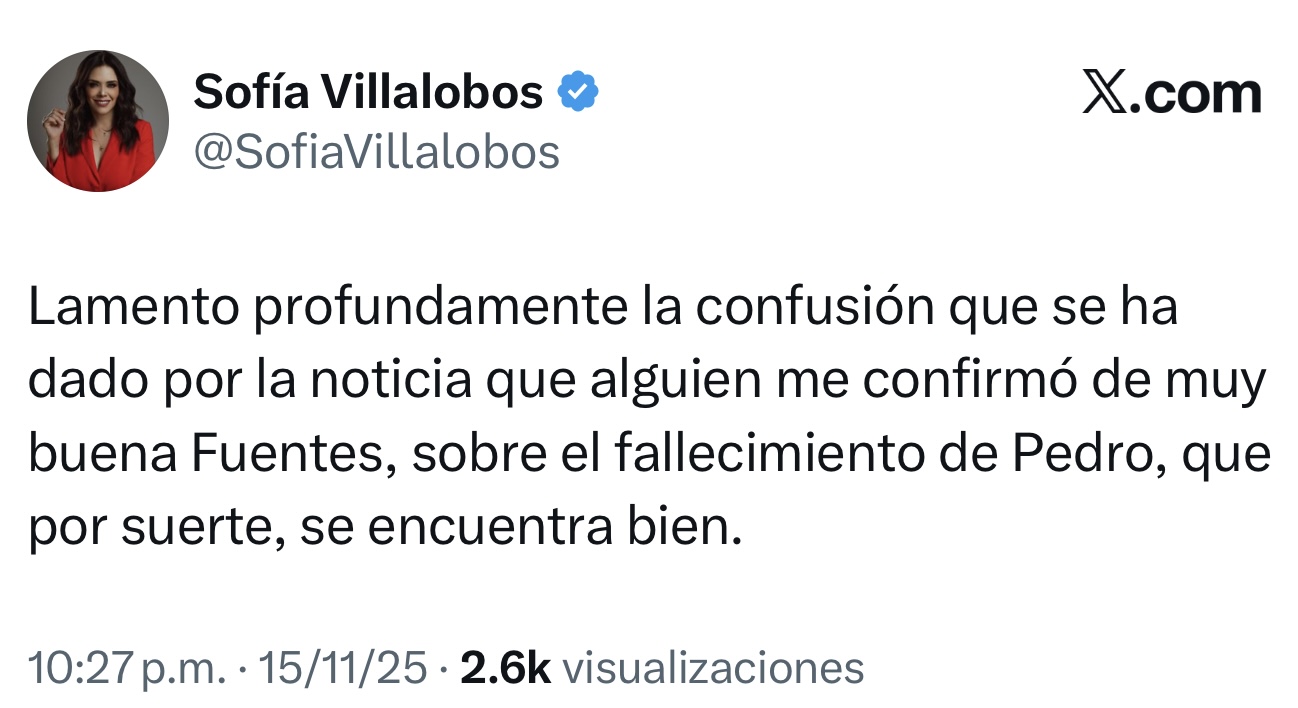 Sofía Villalobos se disculpó en su cuenta de X escribiendo: Lamento profundamente la confusión que se ha dado por la noticia que alguien me confirmó de muy buena Fuentes, sobre el fallecimiento de Pedro, que por suerte, se encuentra bien".
