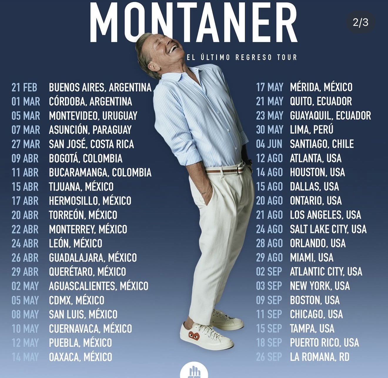 A partir de febrero del siguiente año, el reconocido artista llegará a ciudades como Buenos Aires y Córdoba, en Argentina; Montevideo, Uruguay; Asunción, Paraguay; San José, Costa Rica; así como Bogotá y Bucaramanga, en Colombia.