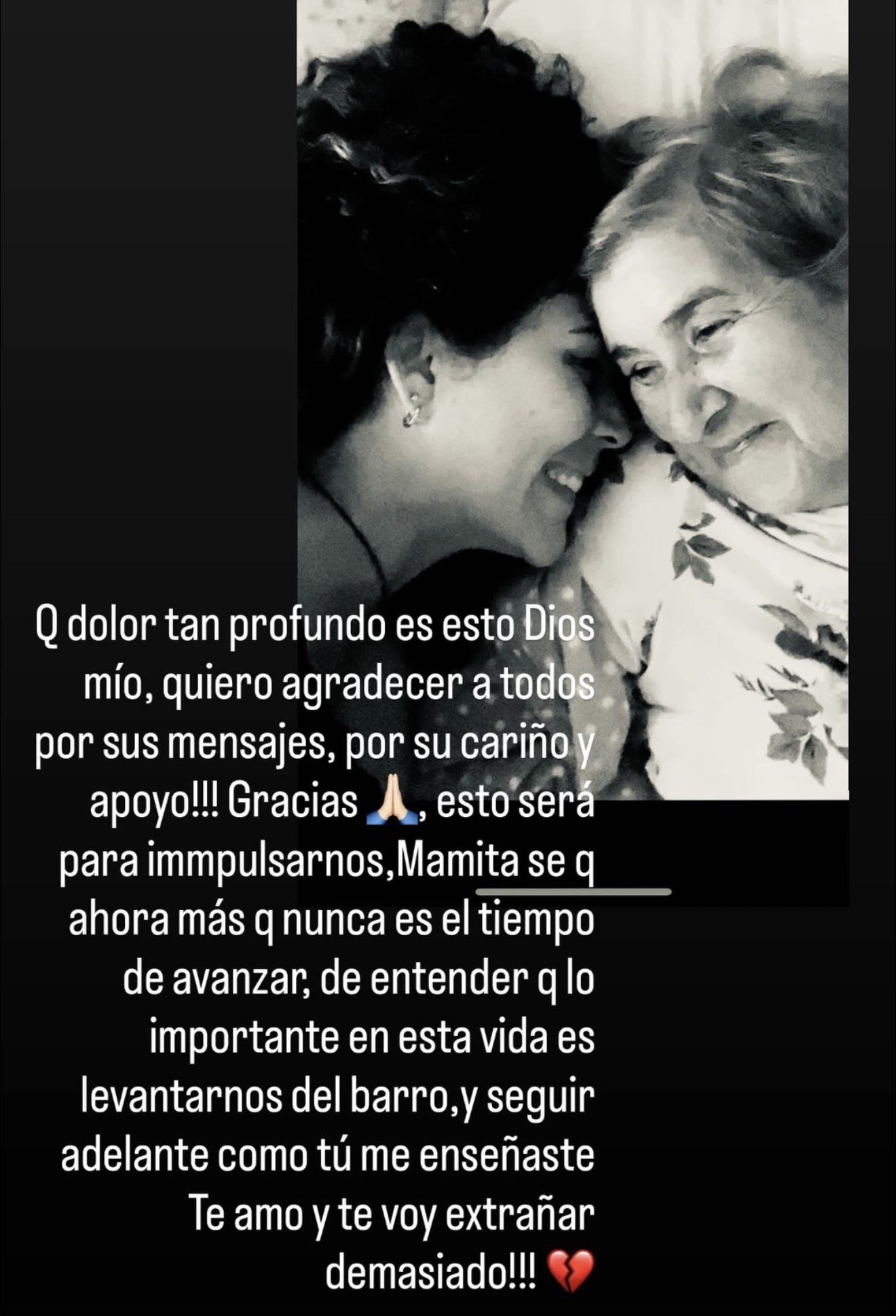 "Qué dolor tan profundo es esto Dios mío, quiero agradecer a todos sus mensajes por su cariño y apoyo. Gracias esto será para impulsarnos, mamita sé que ahora más que nunca es el tiempo de avanzar, de entender que lo importante en esta vida es levantarnos del barro, y seguir adelante como tú me enseñaste. Te amo y te voy a extrañar demasiado", escribió.