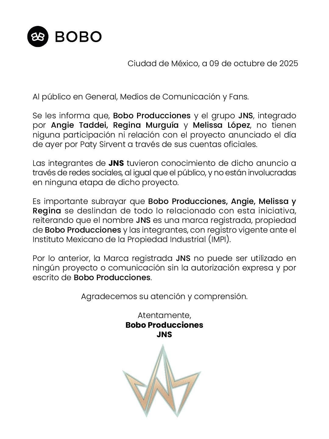 Este jueves, la cuenta oficial de Bobo Producciones publicó un comunicado en el que las JNS se deslindan del proyecto anunciado por Paty Sirvent, revelándose que un nuevo desacuerdo entre ellas.