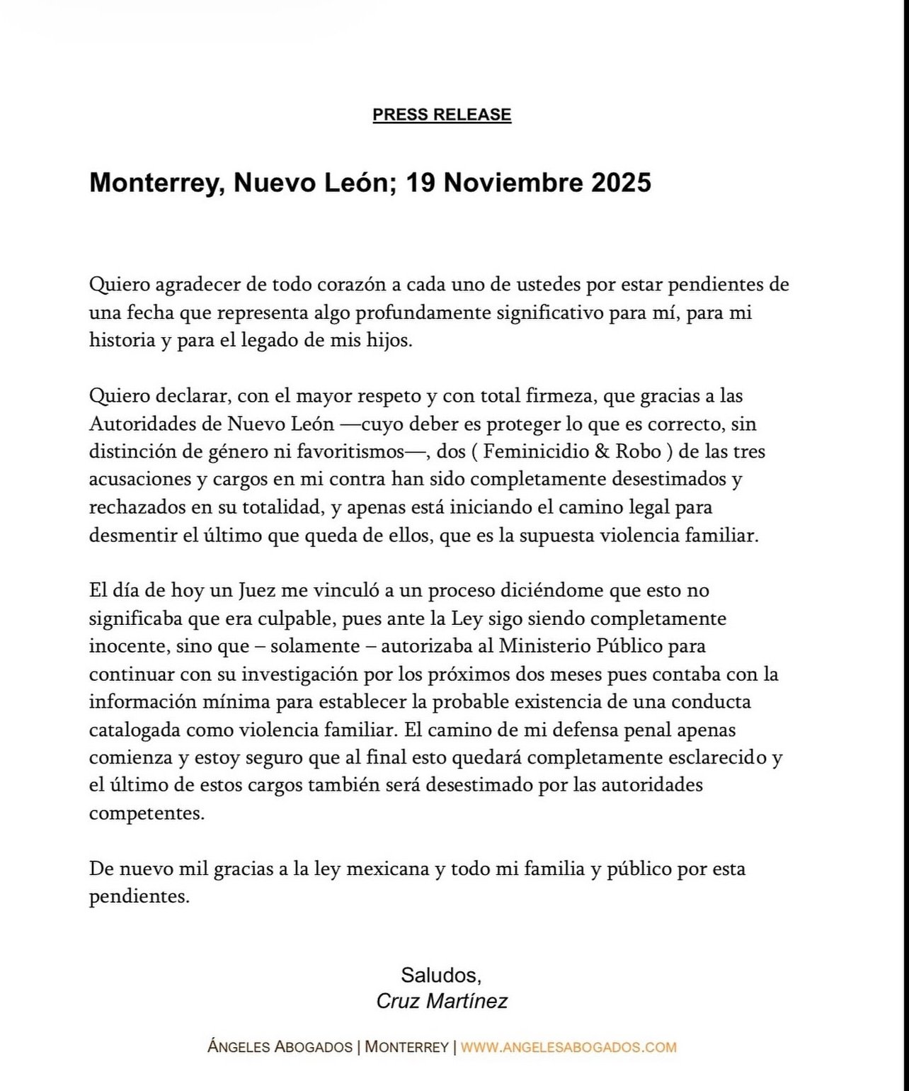 Ante esto, Cruz Martínez publicó un comunicado en el que indica: "Un Juez me vinculó a un proceso diciéndome que esto no significaba que era culpable, pues ante la Ley sigo siendo completamente inocente, sino que autorizaba al Ministerio Público para continuar con su investigación por los próximos dos meses, pues contaba con la información mínima para establecer la probable existencia de una conducta catalogada como violencia familiar”.