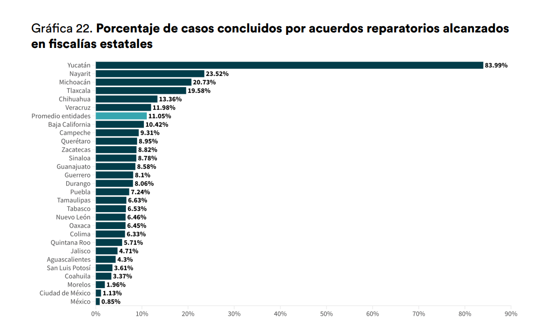Según el informe “Radiografía de la Impunidad, 2024: Hallazgos del Sistema de Justicia Penal en México”, elaborado por la organización México Evalúa, con datos del Censo Nacional de Procuración de Justicia Estatal (CNPJE) 2025, en Aguascalientes, apenas el 4.3% de las carpetas iniciadas en 2024 lograron solucionarse a través de mecanismos alternativos.