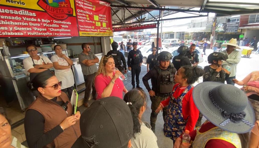 Hay gente que se está manifestando, se siente indignada porque se están violando los artículos constitucionales del 1°, el 5°, el 14°, el 16° y el 21°. Cada vez que la autoridad hace uso excesivo de la fuerza al hacer acto de presencia manifestando que solamente vienen a hacer acto de presencia, lo cual lo cual representa la intimidación a los cientos de comerciantes aquí en el mercado.