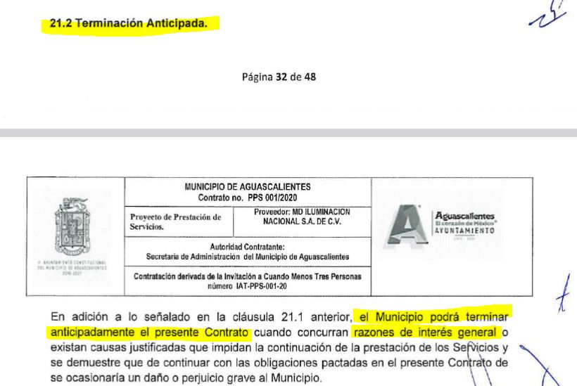 Aunque no se determina aún si las garantías pendientes podrían configurar un incumplimiento de contrato, este compromiso con MD Iluminación sí advierte la figura de "terminación anticipada".