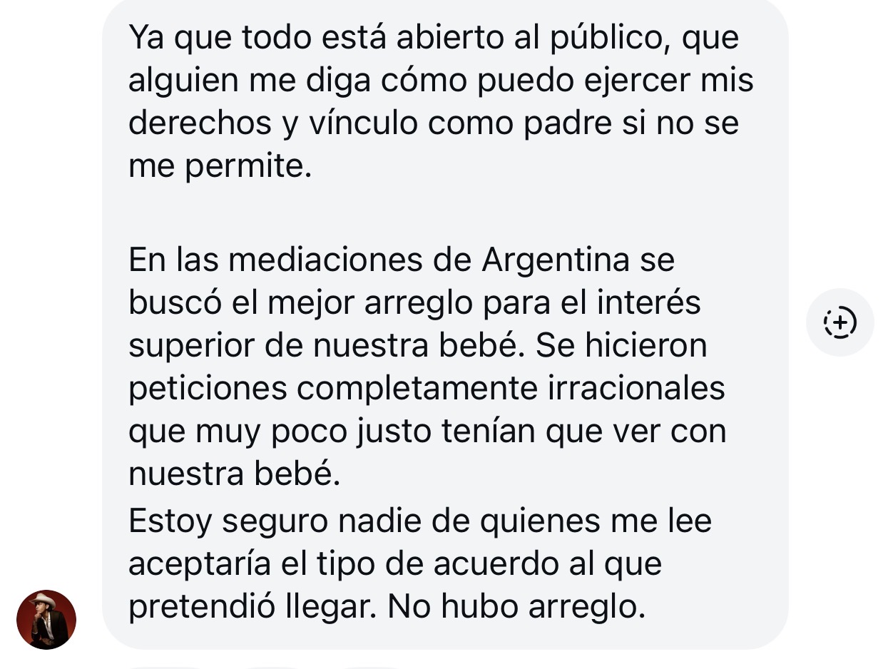 "Bastó con decir que el abogado se comunicaba telepáticamente a través de la mirada que atravesaba una pantalla, diciéndole que ‘teníamos el p*to control sobre nuestra bebé y ella’. Que no demandaría acusando al ‘sistema patriarcal’ en su país. Con eso fue suficiente para asegurar que ejerzo violencia vicaria", se lee en otro de los mensajes.