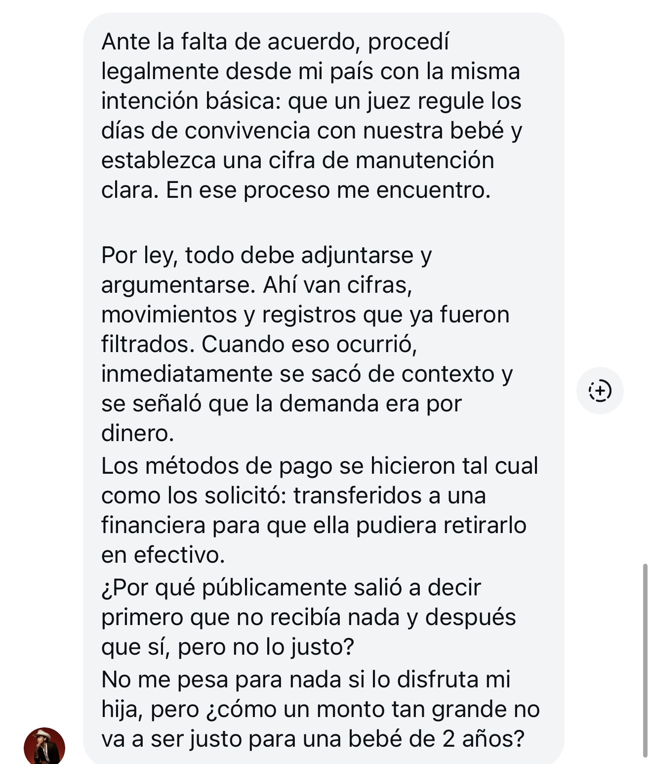"Los métodos de pago se hicieron tal cual como los solicitó: transferidos a una financiera para que ella pudiera retirarlo en efectivo. ¿Por qué públicamente salió a decir primero que no recibía nada y después que sí, pero no lo justo? No me pesa para nada si lo disfruta mi hija, pero ¿cómo un monto tan grande no va a ser justo para una bebé de 2 años?", se lee.