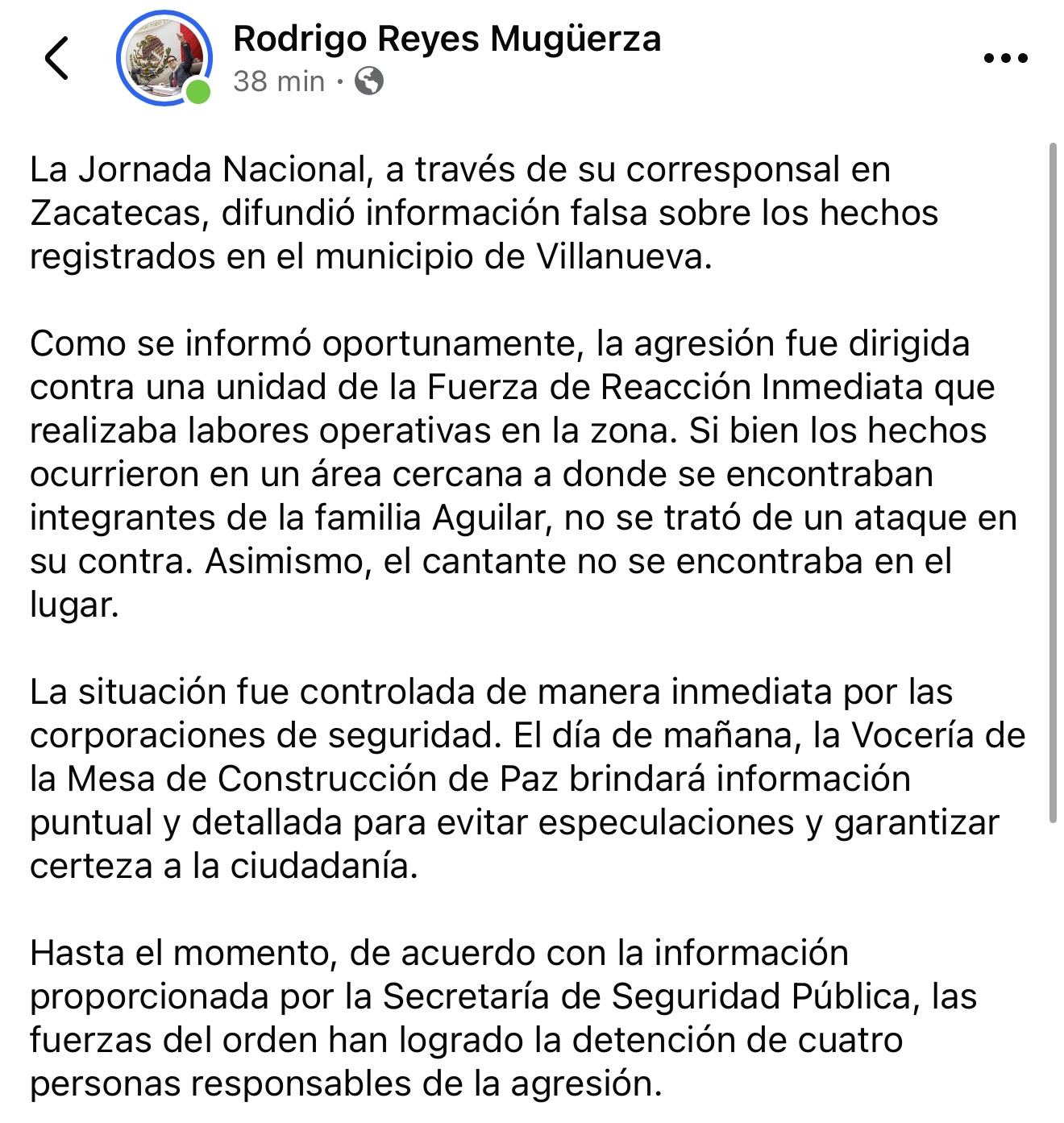 Primero, Rodrigo Reyes Mugüerza, Secretario General del Gobierno del Estado, aclaró que la agresión fue contra una unidad de la Fuerza de Reacción Inmediata y no contra los Aguilar, aunque el hecho sí sucedió cerca de donde se encontraban integrantes de la familia.