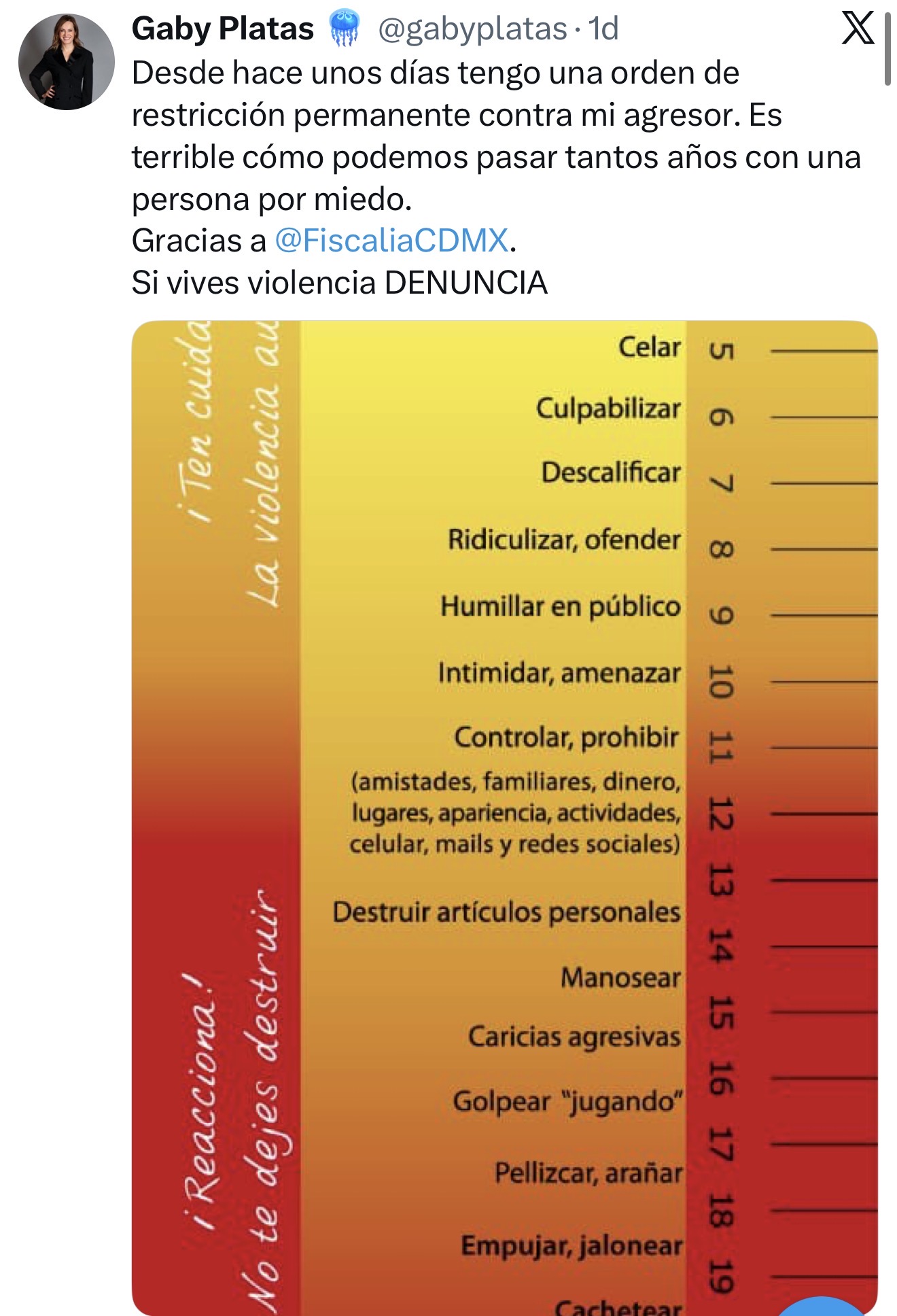 "Desde hace unos días tengo una orden de restricción permanente contra mi agresor. Es terrible cómo podemos pasar tantos años con una persona por miedo. Gracias a la Fiscalía de la CDMX Si vives violencia DENUNCIA”, indicó en su cuenta de X.