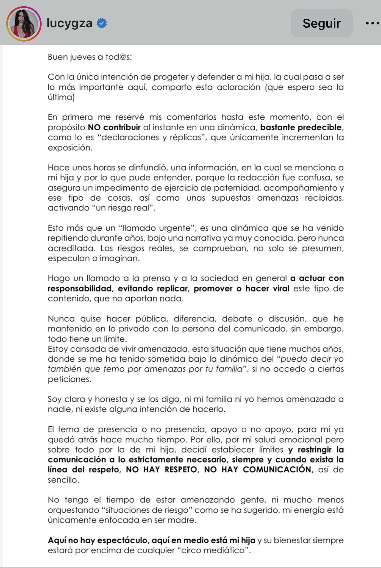 “Con la única intención de proteger y defender a mi hija, quien pasa a ser lo más importante, comparto esta aclaración (que espero sea última). En primera (instancia), reservé mis comentarios hasta este momento con el propósito de no contribuir en una dinámica de ‘declaraciones y réplicas’. Se difundió, una información en la que se menciona a mi hija y, por lo que pude entender, porque la redacción es confusa, se asegura un impedimento de ejercicio de paternidad, acompañamiento y ese tipo de cosas, así como unas supuestas amenazas recibidas, activando ‘un riesgo real’”, expuso al inicio del escrito.