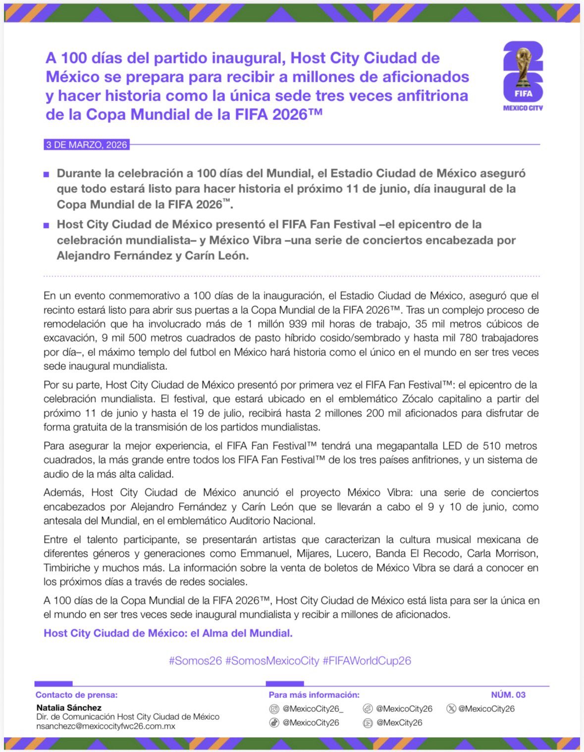 Los organizadores del Mundial en la CDMX, Host City Ciudad de México, anunció la realización del festival musical “México Vibra”, una serie de conciertos previos al Mundial que se llevarán a cabo en el Auditorio Nacional.