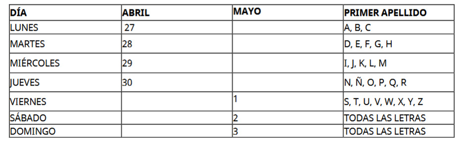 Explicó que el registro se realiza de acuerdo con la letra inicial del primer apellido, bajo el siguiente calendario: